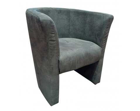 Malé zaoblené křeslo je očalouněno tmavě šedou látkou v optice broušené kůže. Snadno ho umístíte i do menšího prostoru.