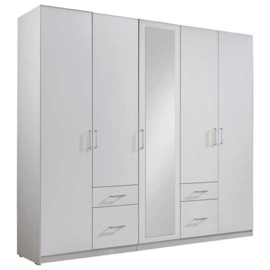 Už zase nemáte ve skříni místo pro nejnovější trendy? Tato velkorysá šatní skříň vyřeší tento problém jednou pro vždy! S celkovou šířkou cca 225 cm budete mít k dispozici dostatek úložného prostoru. Skříň disponuje 4 zásuvkami a 5 dvířky, za kterými se vám naskytne vnitřní vybavení se 3 šatními tyčemi a 3 vkládacími policemi. Prostřední dvířka jsou navíc vybavená zrcadlem. Provedení v bílé harmonicky doplní každý prostor. Rozměry: Š x V x H: cca 225 x 210 x 58 cm. Tato šatní skříň splní všechny vaše přání! – ONLINE ONLY,TYP: 406572, – KP+ČELO: ALPSKÁ BÍLÁ, – 5 DVEŘÍ, 4 ZÁSUVKY,