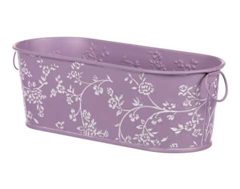 Dekorativní kovový obal na květiny/truhlík ve fialové barvě s bílými růžičkami doladí každý interiér. Nejen praktický doplněk, ale i pěkná dekorace na květiny. Délka 27,5 cm.