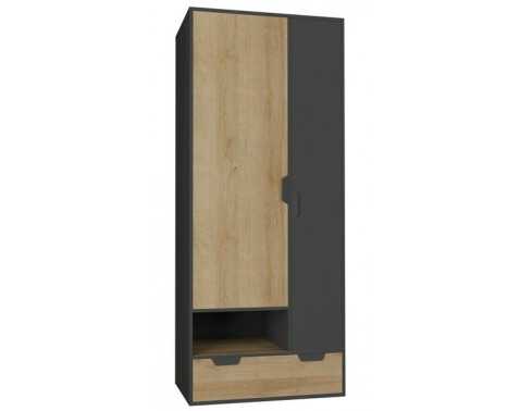 Šatní skříň z programu Nano obsahuje praktické úložné prostory a zaujme svým vzhledem v kombinaci útulného dubového dekoru a grafitové barvy. Hodí se pro vybavení pokoje dětí, teenagerů i dospělých.
